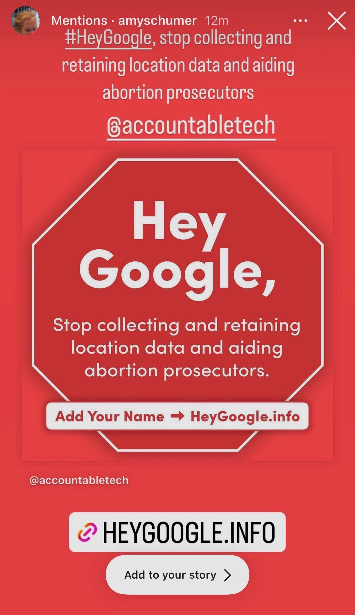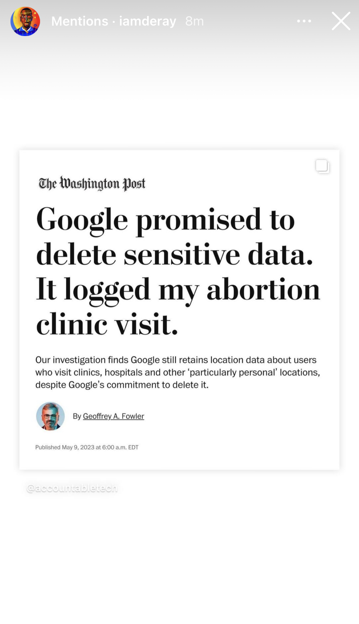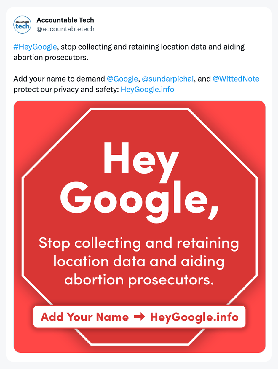After the Supreme Court overturned Roe v. Wade in 2022, I worked with Accountable Tech's team to test Google's policy to protect the privacy of users who visit abortion clinics. We found that the company is still collecting and retaining this sensitive location data, which could be weaponized by right-wing state governments to prosecute those seeking or assisting with reproductive health care. We launched a direct advocacy campaign in collaboration with dozens of influencers calling on Google to stop collecting and retaining location data and aiding abortion prosecutors. Our research and campaign received coverage from The Guardian, NBC News, The Washington Post, Jezebel, and The Register.