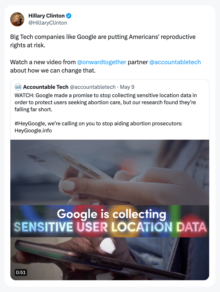 After the Supreme Court overturned Roe v. Wade in 2022, I worked with Accountable Tech's team to test Google's policy to protect the privacy of users who visit abortion clinics. We found that the company is still collecting and retaining this sensitive location data, which could be weaponized by right-wing state governments to prosecute those seeking or assisting with reproductive health care. We launched a direct advocacy campaign in collaboration with dozens of influencers calling on Google to stop collecting and retaining location data and aiding abortion prosecutors. Our research and campaign received coverage from The Guardian, NBC News, The Washington Post, Jezebel, and The Register.